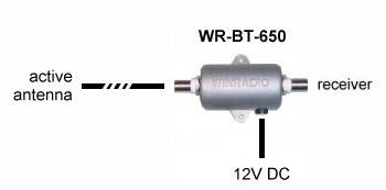 如圖,有源天線(例如ax-81s天線)是由同軸電纜供電的。在接收端,電源通過wr-bt-650這個“T”型裝置注入同軸電纜。這樣可以在不增加其它電纜的情況下方便地為有源天線供電。