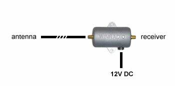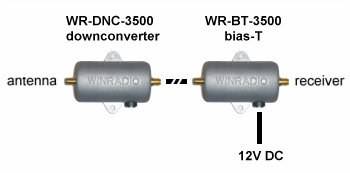 方式一:下變頻器安裝到天線和接收機之間的接收機端,通過帶SMA接頭的低損耗同軸電纜相連。在這種安裝方式下,電源直接連接到下變頻器。我們建議使用性能好的濾波電源,如Winradio的 SF-41系列電源(該電源隨下變頻器一起提供)。
